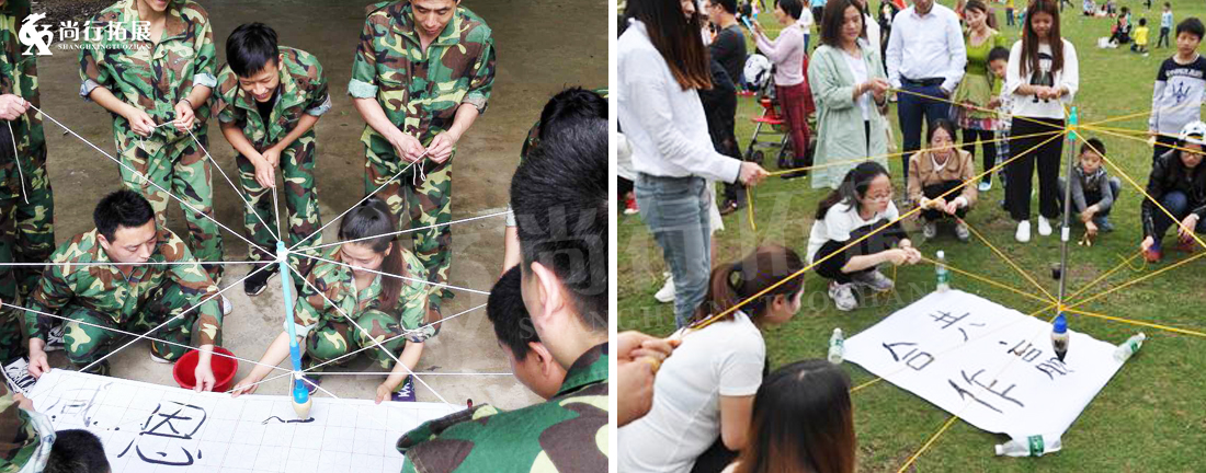 神筆馬良又叫妙筆生花,本項目將團隊成員分成多個小組,在地上放一張一平米左右大的白紙,每個小組所有隊員拉繩子的末端,在不接觸毛筆的情況下,按照教練的要求完成指定的任務。最快完成的團隊獲勝。