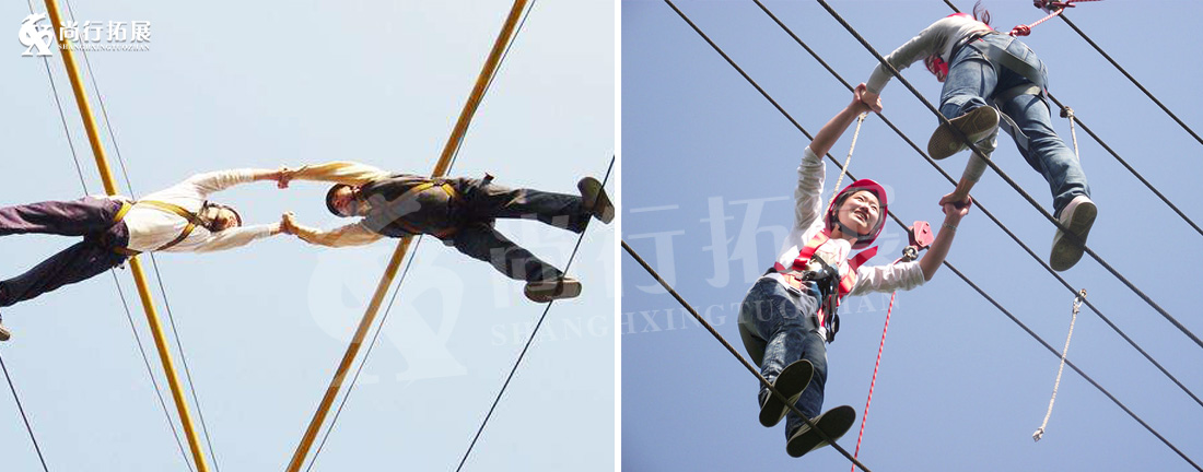 相依為命別稱倆倆相依、相依相助,相依為命是一個(gè)雙人合作挑戰(zhàn)的高空拓展訓(xùn)陳練項(xiàng)目,成員按2人一組組合,兩位隊(duì)員一正一反站在鋼絲上,手心相對(duì)地共同挑戰(zhàn)位于8米高空中的鋼絲項(xiàng)目任務(wù)。離地面8米處,由兩根鋼絲繩并排構(gòu)成了一端窄,另一端寬的∨字型鋼絲橋”,兩個(gè)人面對(duì)面手挽手從窄的起走向?qū)挼囊欢耍瑑蓚€(gè)隊(duì)員各踩一條繩索,互相支撐著逐步移向分岔越來越大的另一端。