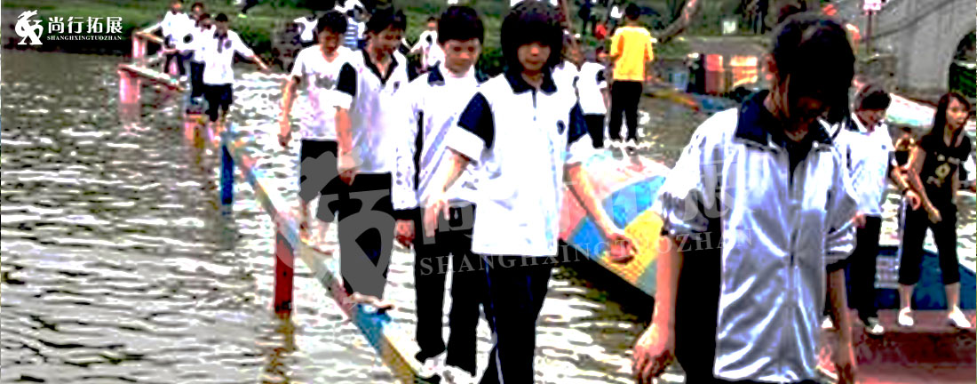 此項目為挑戰(zhàn)個人勇氣類水上拓展項目,學(xué)員依次走過橫穿跨越水面的平衡木,過程中要注意平衡免得掉入水中。