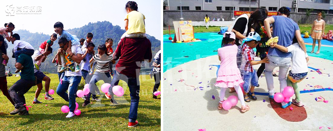 玩法:每個家庭由一名家長和一名幼兒參加,老師給每個家庭發(fā)一個氣球和一根細繩,請家長將氣球吹大綁在自己的腳腕,身背幼兒。聽到老師的口令游戲開始,家長就背著寶寶踩其他家庭的氣球,氣球被踩爆即被淘汰,比一比誰是冠軍。