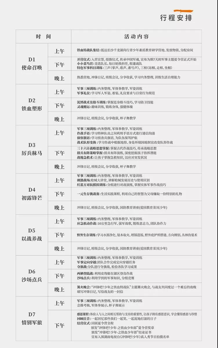 《沖鋒吧!少年》線下暑假營(yíng)采取積分制度,積分最高者將獲得“沖鋒少年”勛章,每個(gè)營(yíng)積分前兩名,免費(fèi)參加湖南電視臺(tái)青少年國(guó)防素質(zhì)教育電視欄目《沖鋒吧!少年》。