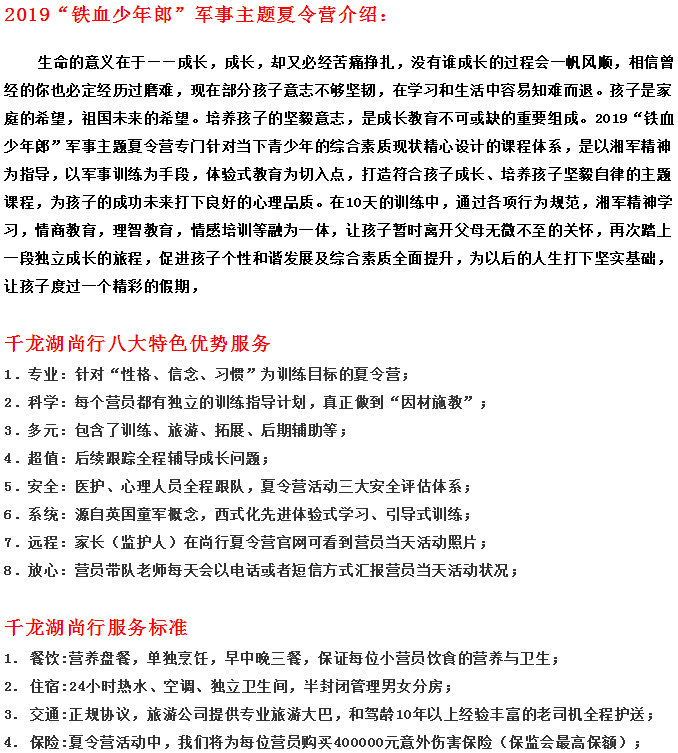 讓孩子親身去經(jīng)歷,不是在書籍里讀到的,不是在電視機里看到的,而讓他們自己去感受,身處其中地去領(lǐng)悟,探尋孩子們不曾了解過的軍旅,2019千龍湖尚行“鐵血少年郎”軍事主題夏令營。