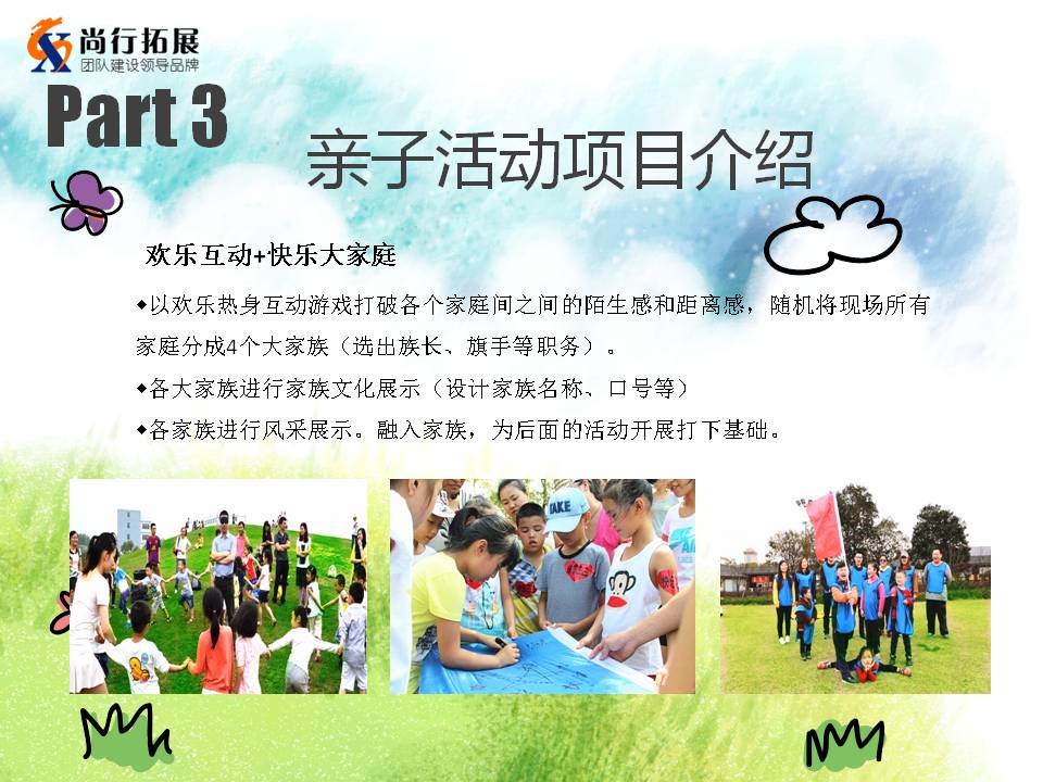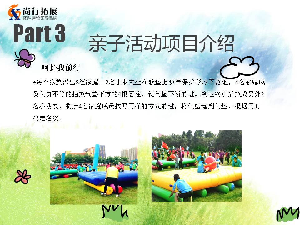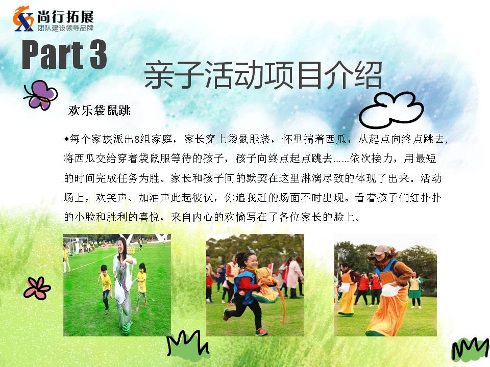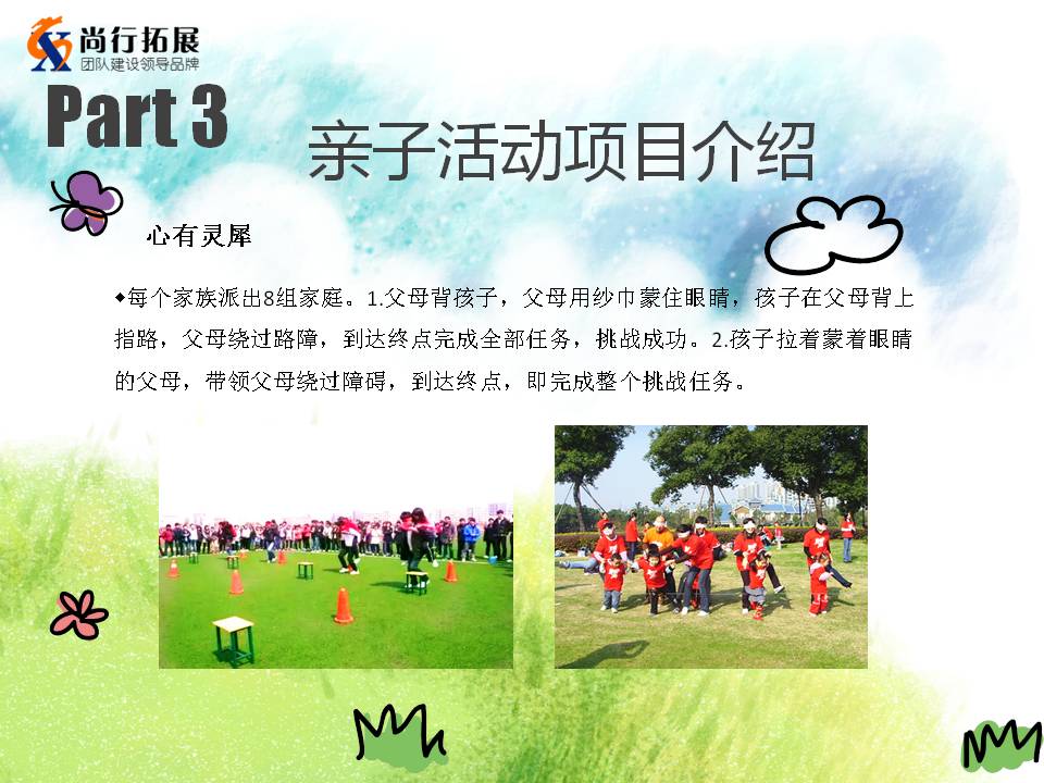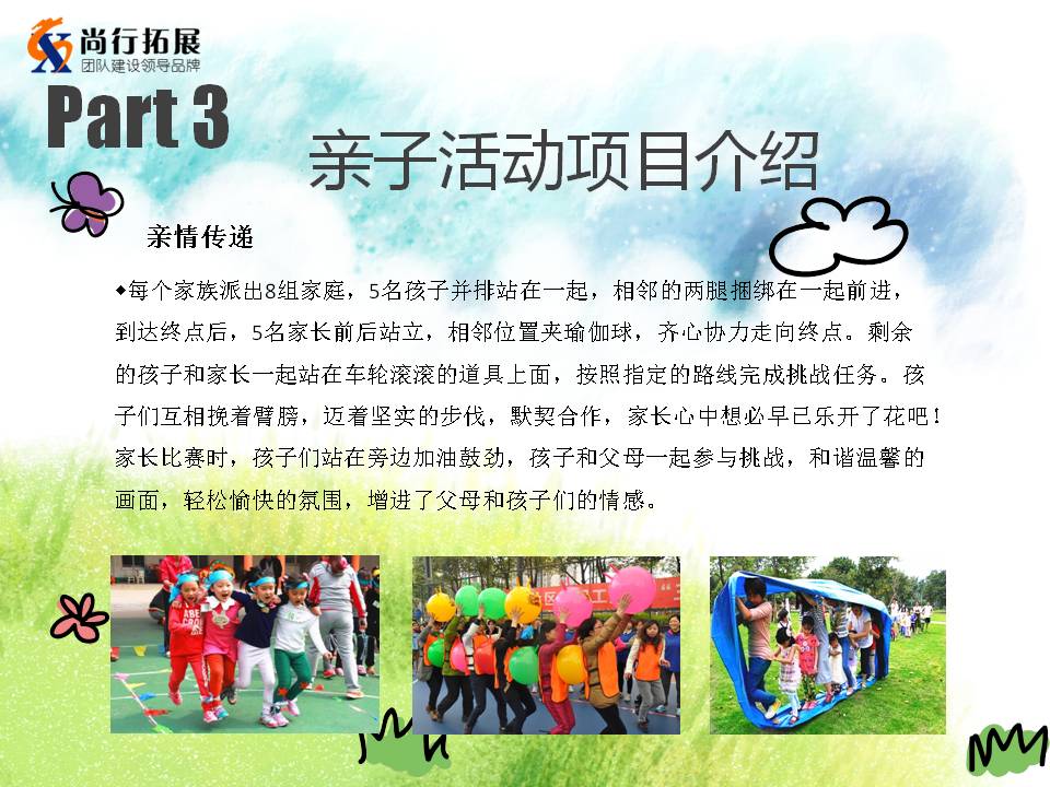 其次,親子活動有利于孩子身心的健康成長。親子活動寓教于樂,寓知識于游戲中,同時開發(fā)孩子的智力,提高其動手能力、反應(yīng)力、創(chuàng)造力,使孩子能在德、智、體、美、勞各方面得到全面發(fā)展!
