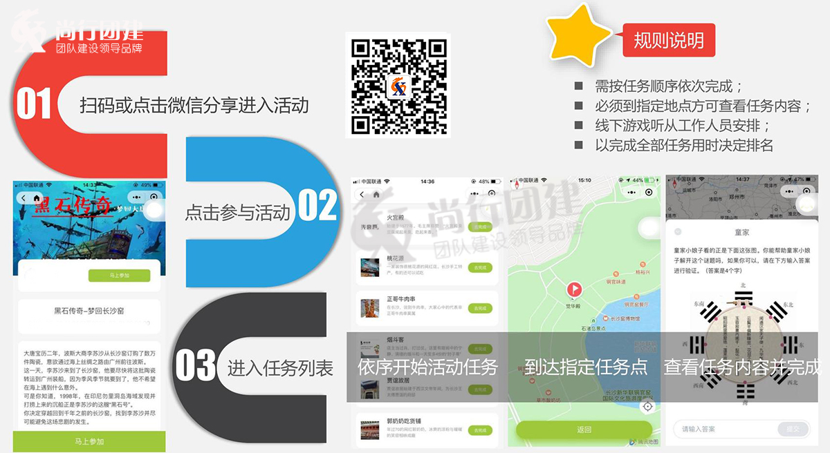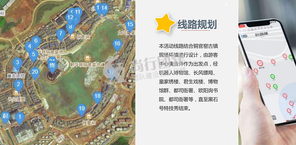 跑男同款玩法,團(tuán)隊(duì)配合游戲,在古鎮(zhèn)中設(shè)置多個(gè)任務(wù)打卡地點(diǎn),通過(guò)完成任務(wù)來(lái)占領(lǐng)點(diǎn)位,最終點(diǎn)位連接后面積最大的隊(duì)伍獲得勝利。