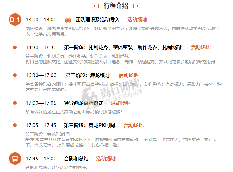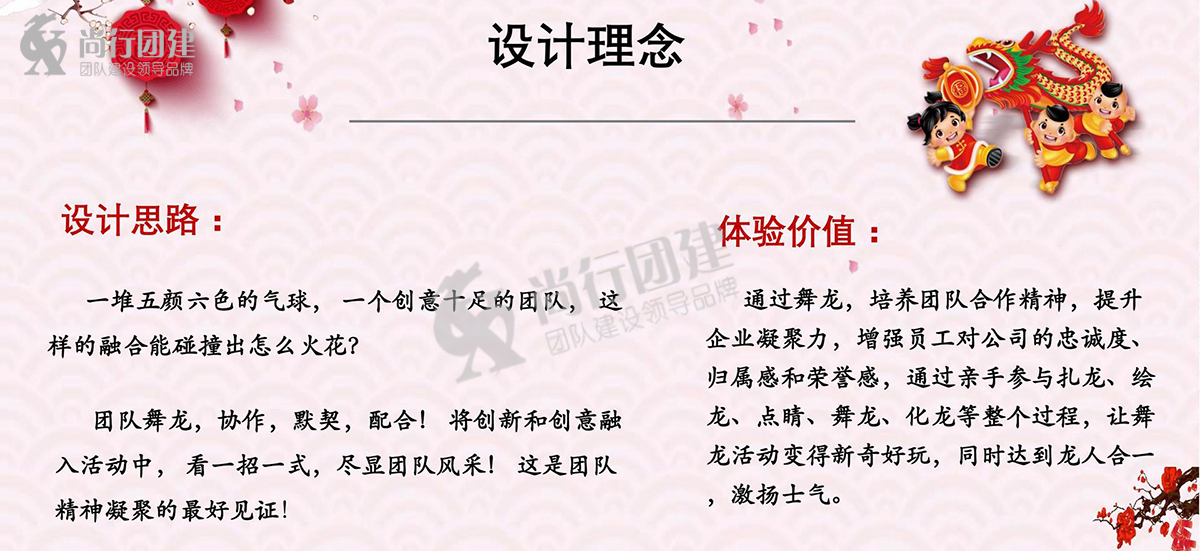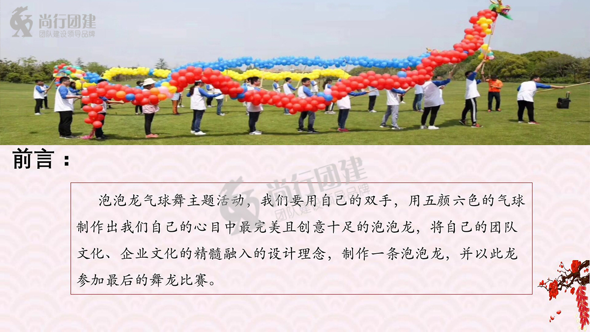 推薦理由:泡泡龍氣球舞龍創(chuàng)意團(tuán)建,我們要用自己的雙手,用五顏六色的氣球制作出我們自己的心目中最完美且創(chuàng)意十足的泡泡龍,將自己的團(tuán)隊(duì)文化、企業(yè)文化的精髓融入的設(shè)計(jì)理念,制作一條泡泡龍,并以此龍參加最后的舞龍比賽。