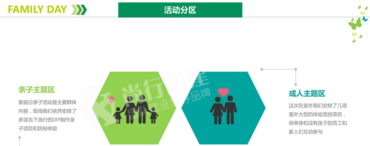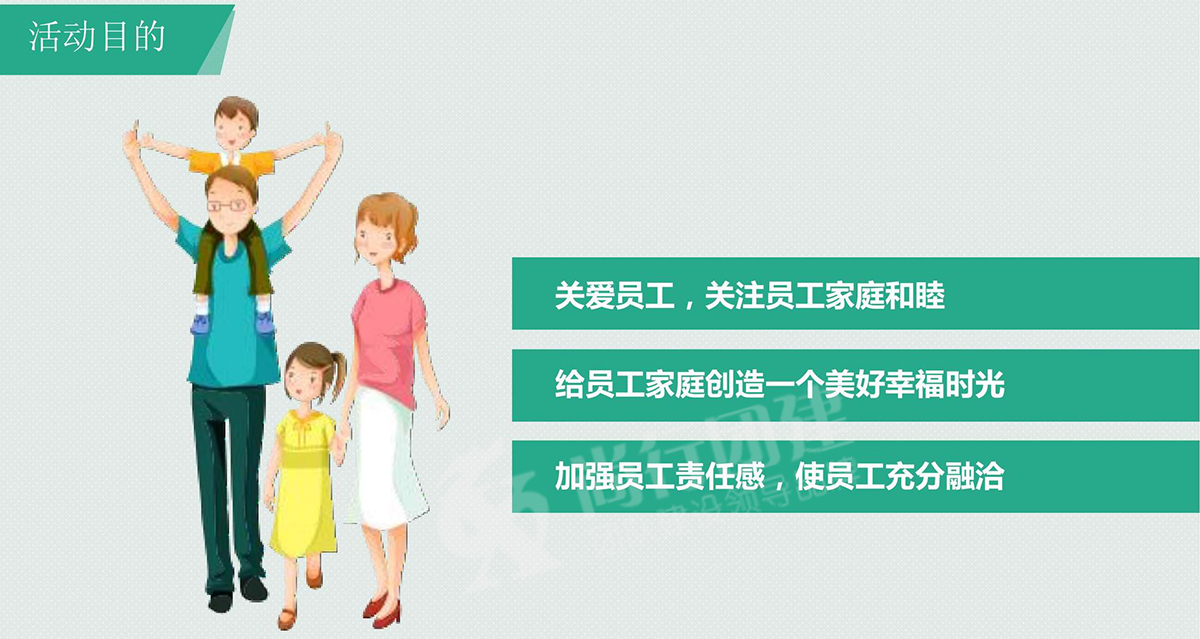 員工家庭日突出家庭概念的團隊活動,員工攜家屬共同參與,在輕松愉快的環(huán)境中,使員工及其家屬感受企業(yè)文化,體現(xiàn)企業(yè)凝聚力,充分展現(xiàn)企業(yè)品牌風范。使員工家屬知道自己的親人在公司里工作很安全。在Family Day活動中,將展示員工、團隊的工作業(yè)績與成就,由此激發(fā)員工及其家屬的自豪感,更會贏得家屬對親人的理解與支持。從而達到加強企業(yè)與員工、企業(yè)與員工家屬間的雙向溝通與交流,融洽企業(yè)團隊成員關系,創(chuàng)設和諧發(fā)展的企業(yè)氛圍,增強企業(yè)凝聚力,體現(xiàn)企業(yè)親和力,建立企業(yè)員工自信心。