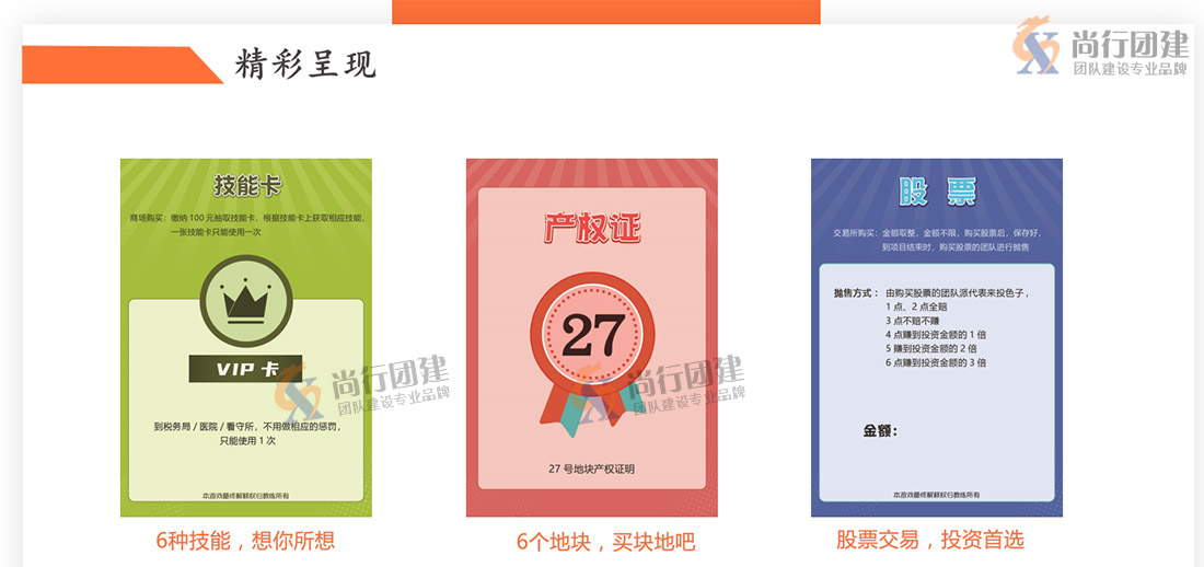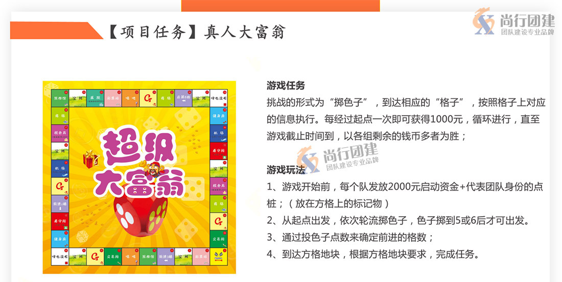 超級大富翁·真人版融入了更加多元化的游戲元素,采用沙盤底層設計邏輯與競技特征相結合展開設計,把更多樣化的體驗形式融入到一場游戲互動場景中游戲過程跌宕起伏,情節(jié)反轉樸樹迷離;有實力打拼,也有運氣成分;有個人挑戰(zhàn),也有團隊協(xié)同;有最強大腦,也有音樂藝術;有游戲挑戰(zhàn),也有邏輯推理;有運動,也有思考;有全局規(guī)劃,也有細節(jié)把控;有領導藝術,也有溝通技巧;有換位思考,也有快速執(zhí)行。