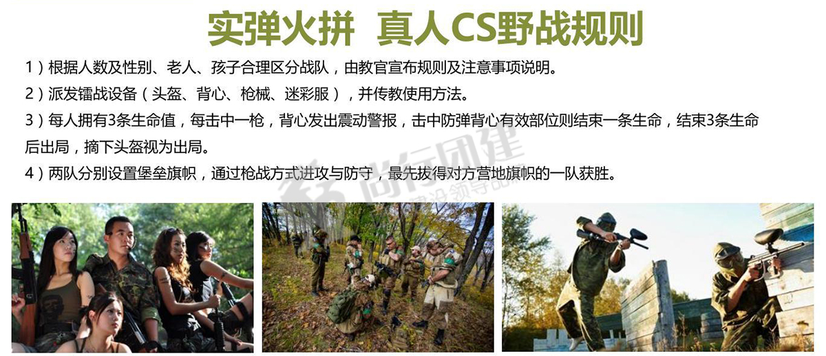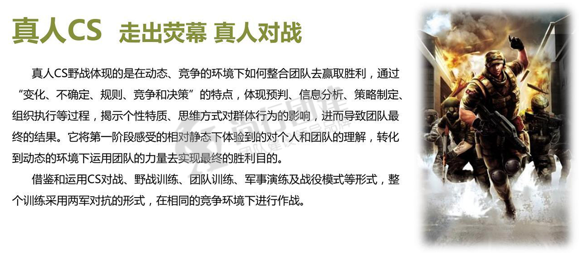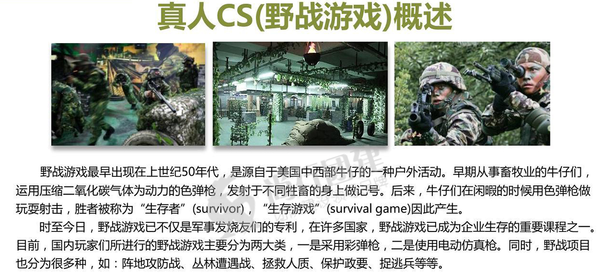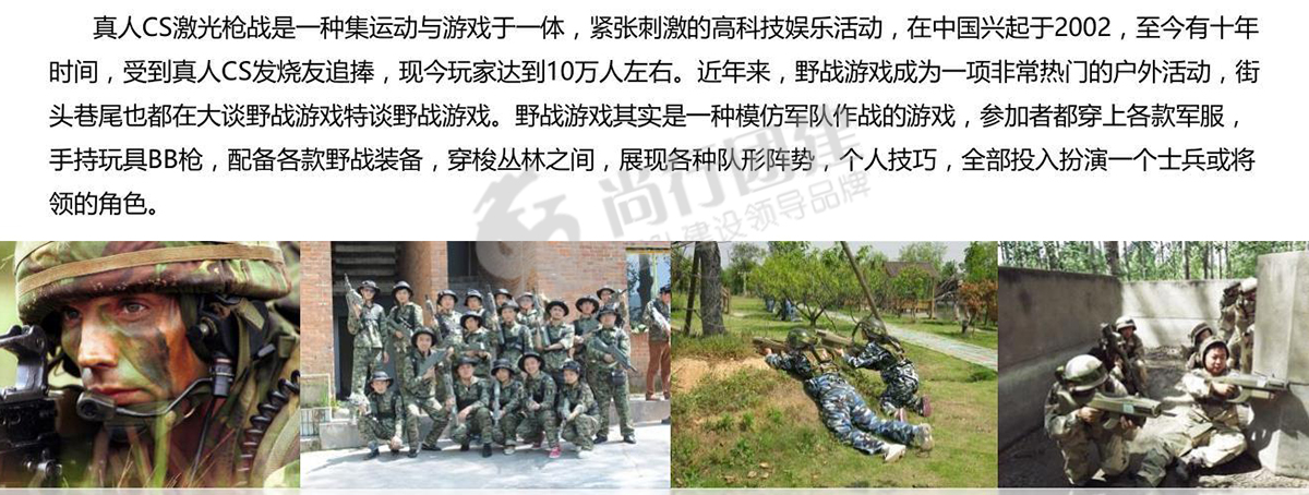 內(nèi)容:以提升團(tuán)隊(duì)凝聚力和團(tuán)隊(duì)士氣為目標(biāo)進(jìn)行的團(tuán)隊(duì)建設(shè)活動(dòng),參加者將組建自己的 連隊(duì)(連長(zhǎng)、指導(dǎo)員、班長(zhǎng)、連隊(duì)名稱等)與其他連隊(duì)進(jìn)行各種任務(wù)模式下的激光對(duì)抗,每場(chǎng)戰(zhàn)斗用時(shí)15~20分鐘不等,教官在戰(zhàn)斗之間教授基本戰(zhàn)術(shù)動(dòng)作和戰(zhàn)術(shù)安排。